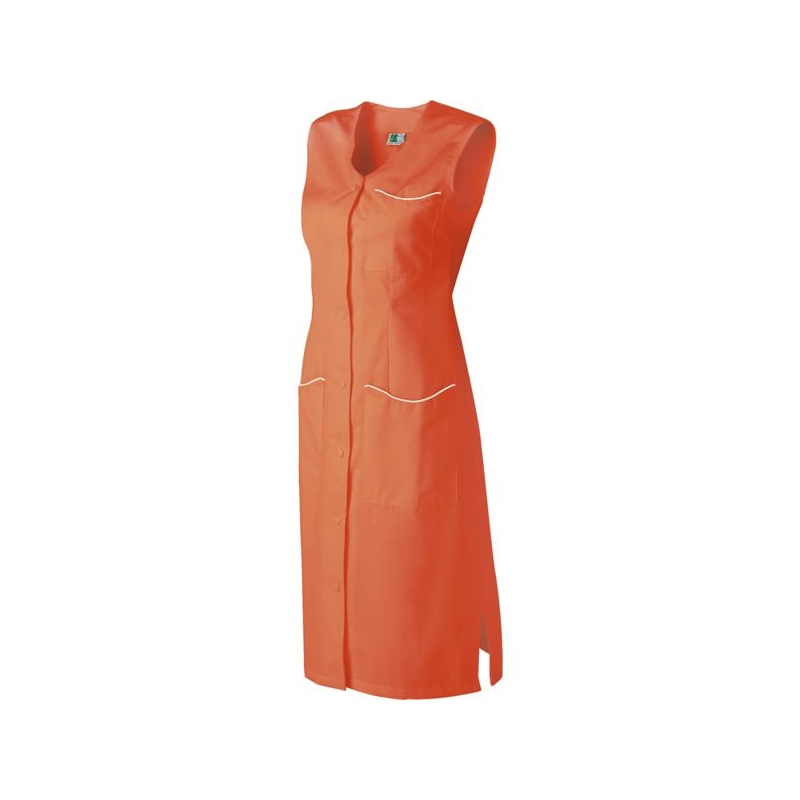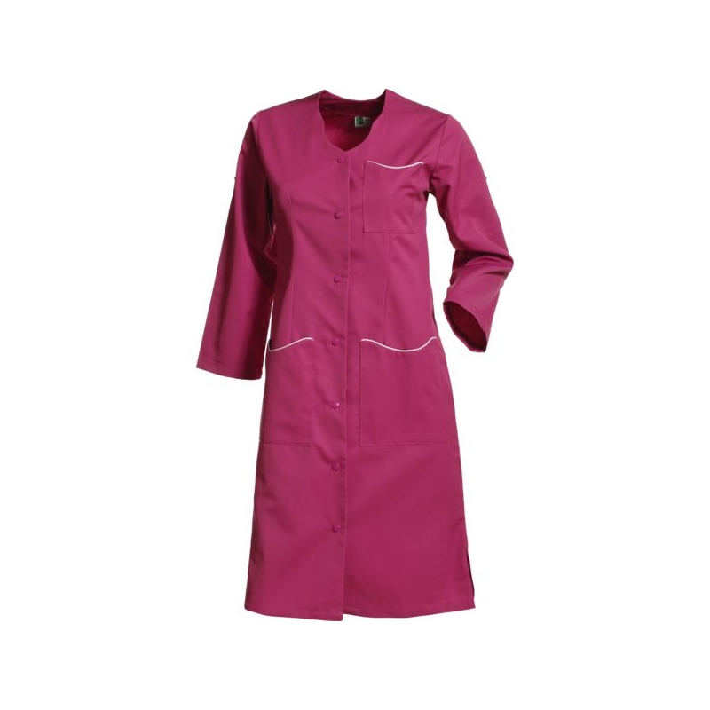 65% polyester 35% coton - Sergé, 210 g/m². Sans col, 1 poche poitrine, 2 poches basses, fentes côtés, fermeture par pressions couleur. Longueur : 105 cm Entretien : adapté au lavage industriel selon la norme ISO 15797 Coloris : parme, rose, vert anis, gris perle, blanc Taille : 0 à 6