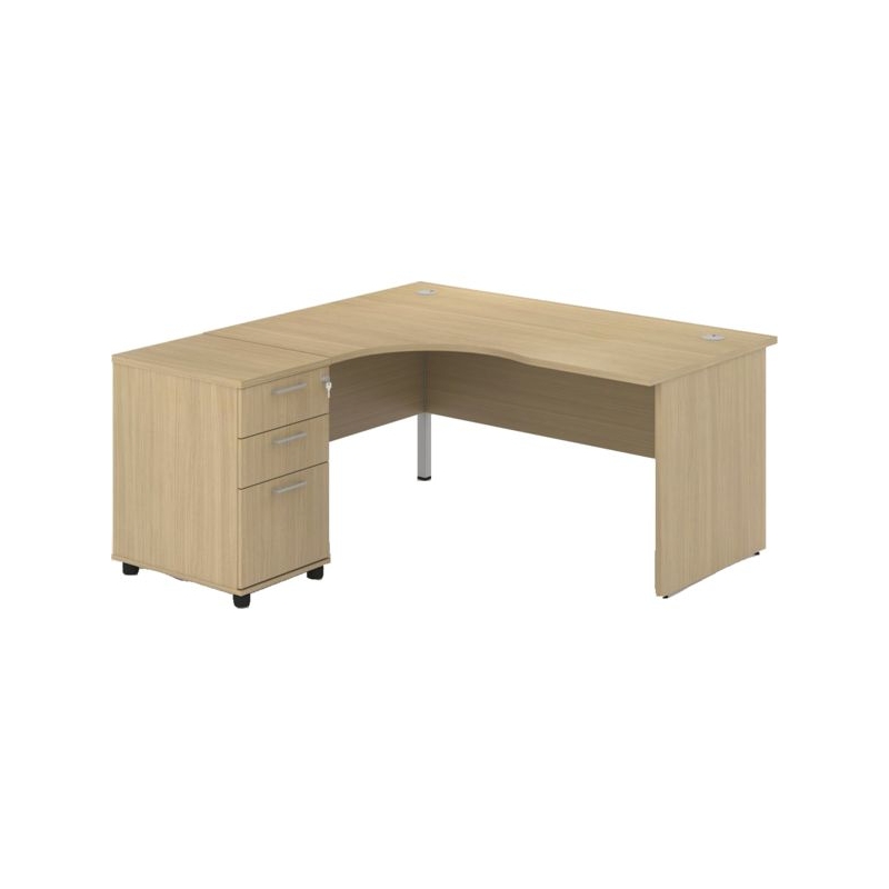 Bureau droit en mélaminé décor chêne blanchi avec plan de travail de 25 mm d'épaisseur. 2 vérins de réglage discrets sous chaque pied panneau. 2 perçages pour passage câble avec obturateur, goulotte passe-câbles (en option). Caisson mobile 3 tiroirs à fermeture centralisée, dont un pour dossiers suspendus. Dim. bureau (L x P x H) : 1600 x 800 x 720 mm Dim. caisson (L x P x H) : 415 x 500 x 638 mm Coloris : chêne blanchi Compatible avec le chargeur QI sans fil réf. 100583, le bloc encastrable prise électrique + USB réf. 100584, et la goulotte réf. 100582. Livré démonté.