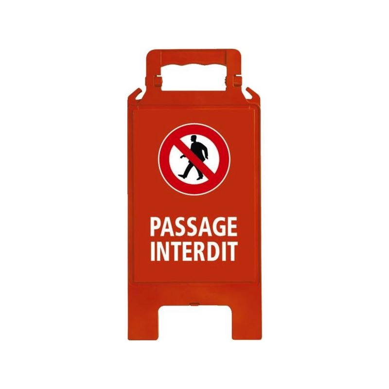 En polypropylène avec renforts de maintien. Utilisation temporaire intérieure et extérieure. Poignée ergonomique, large surface d'impression. Clip de maintien en position ouverte, grande stabilité. Crochets pour chaîne de signalisation. H x l : 600 x 275 mm Épaisseur (plié) : 23 mm