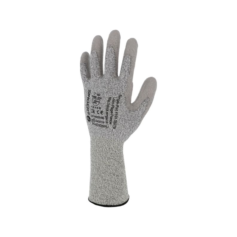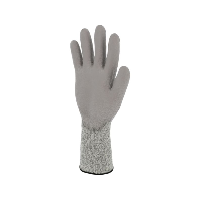 Enduction polyuréthane souple sur la paume. Support tricoté en fibres haute ténacité HDPE (polyéthylène haute densité PEHD), sans couture, jauge 13. Dos aéré, poignet élastique long avec renfort. Renfort entre le pouce et l'index. Risque coupure. Environnement : sec, légèrement humide Applications métiers : manutention de tôles coupantes, fabrication de tôles, assemblage automobile, maintenance industrielle, prise de câbles, d'objets coupants, manipulations de matériaux bruts, abrasifs, de carrelages, de céramiques Taille : 8 à 11 Norme : CE Cat II - EN 388 (4X43D)