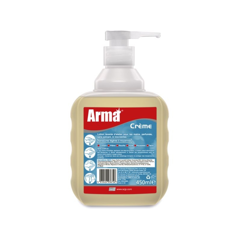 Pour salissures légères. Lotion lavante d'atelier pour les mains, sans solvant ni microbilles, agréablement parfumée. Formule glycérinée adaptée aux lavages fréquents. Efficace contre : ciment, terre, plâtre, huile, rouille, poussière. Utilisation : industrie lourde, construction, maintenance et réparation automobile. La cartouche s'utilise avec le distributeur réf. 14974-4.