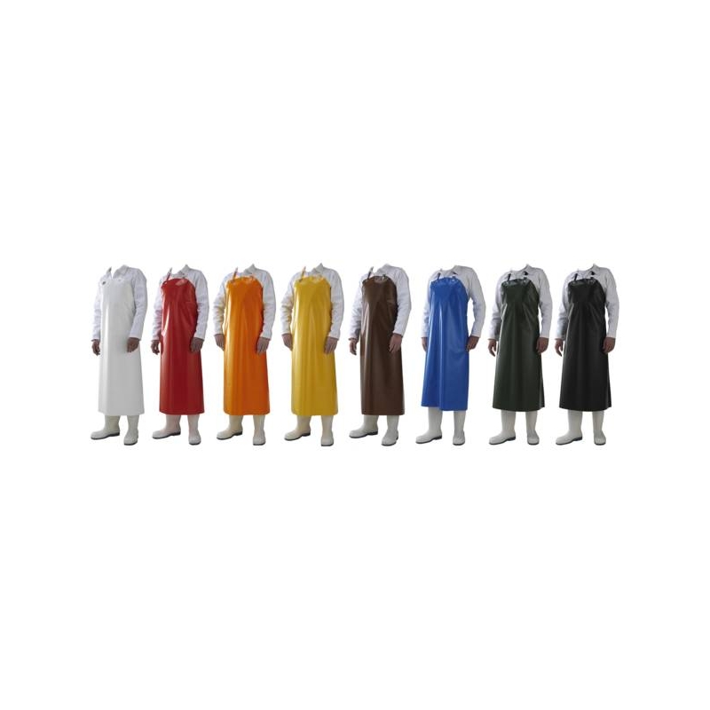 100% polyuréthane, 355 g/m². Sangle réglable autour du cou, fixation arrière par crochet inox et élastique. Résistant aux graisses animales, au sang et aux produits d'entretien courants. Résistant à l'acide chlorhydrique à 30% et à l'eau de javel à 40 ° chlorométrique. Protection contre les éclaboussures. Très lisse, brillant, se nettoie facilement. Reste souple. Contact alimentaire. Dimension : 90 x 115 cm Épaisseur : 300 µ Coloris : blanc, bleu, jaune, marron, rouge, vert Taille : unique Norme : CE Cat II - EN 14325