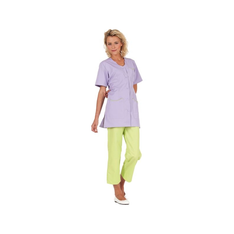 65% polyester 35% coton - Sergé, 210 g/m². Encolure fantaisie, manches courtes, fentes côtés, fermeture par pressions recouvertes. 1 poche poitrine, 2 poches basses plaquées. Longueur : 80 cm Entretien : adapté au lavage industriel selon la norme ISO 15797 Coloris : blanc, gris perle, parme, rose, vert anis Taille : 0 à 6