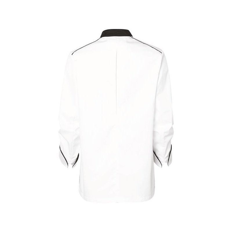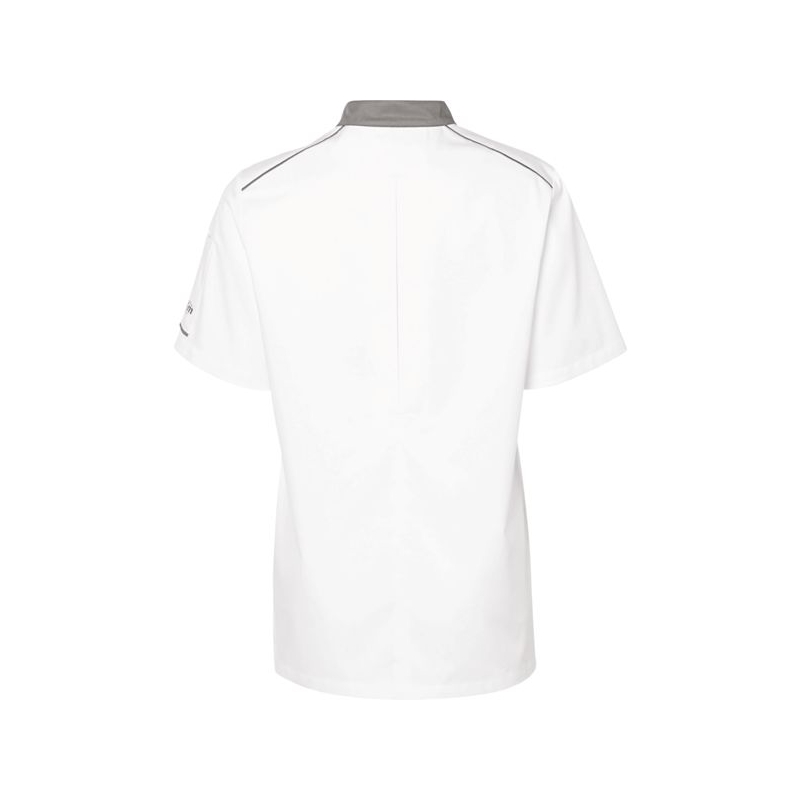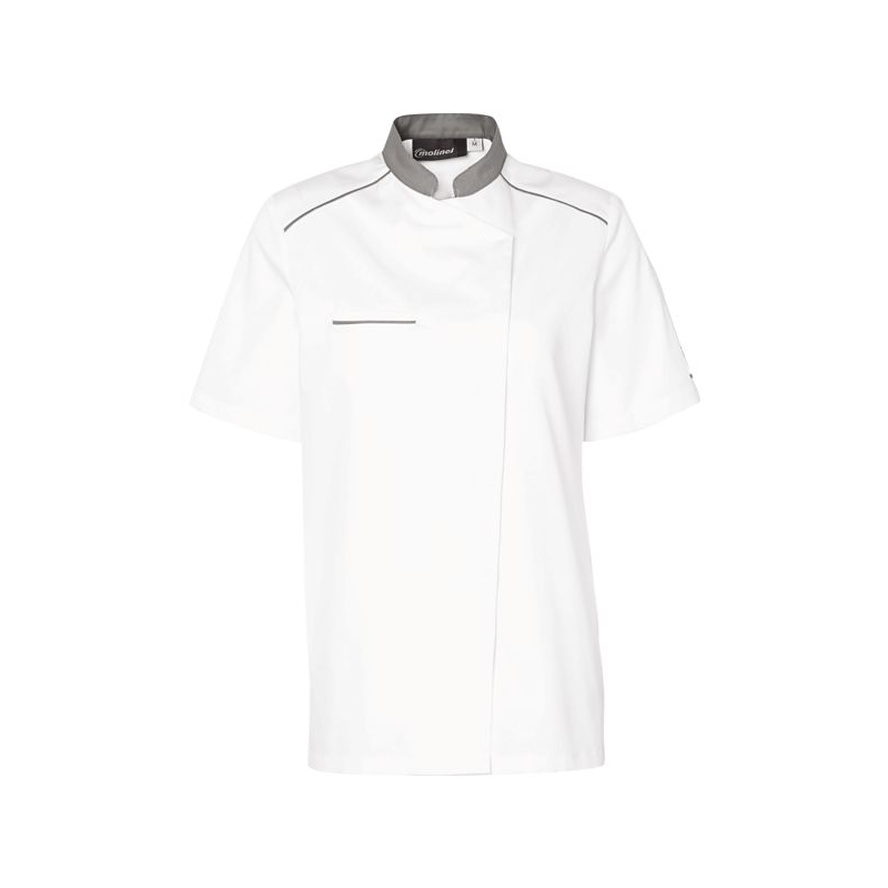 65 % polyester 35 % coton - Sergé 210 g/m² Maille respirante alvéolée double face antibactérien 100% polyester, 160g/m². Col officier et liseré contrastés. Fermeture asymétrique par pressions non apparentes. 1 poche poitrine côté gauche. 1 poche stylo sur manche gauche. Soufflet dos et empiècement aisselle en maille respirante antibactérienne. Coloris : blanc/gris, blanc/noir, blanc/blanc, blanc/denim, blanc/terracotta Taille : 00 à 6