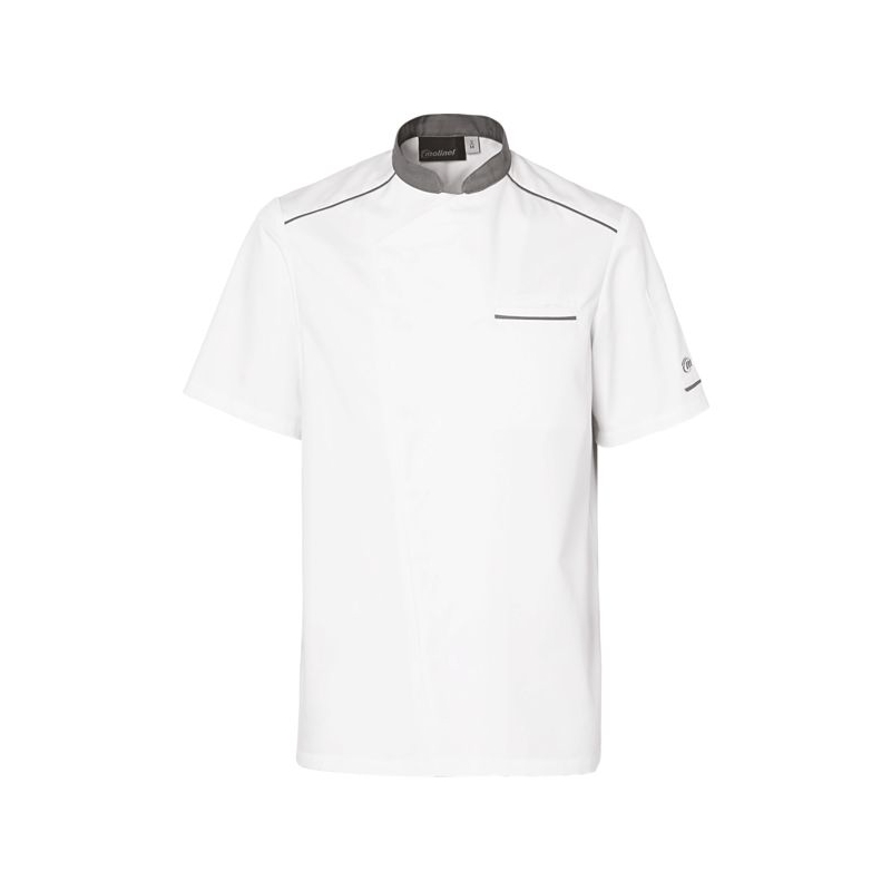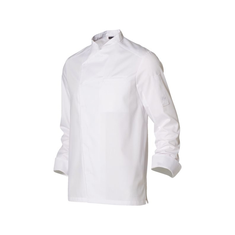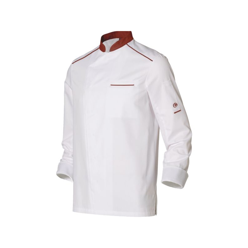65 % polyester 35 % coton - Sergé 210 g/m² Maille respirante alvéolée double face antibactérien 100% polyester, 160g/m². Col officier et liseré contrastés. Fermeture asymétrique par pressions non apparentes. 1 poche poitrine côté gauche. 1 poche stylo sur manche gauche. Soufflet dos et empiècement aisselle en maille respirante antibactérienne. Coloris : blanc/gris, blanc/noir, blanc/blanc, blanc/denim, blanc/terracotta Taille : 00 à 6