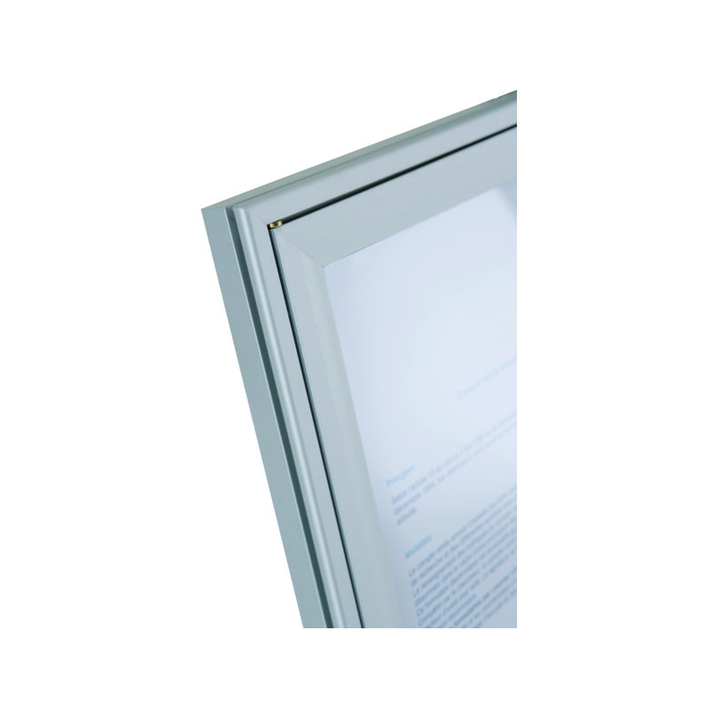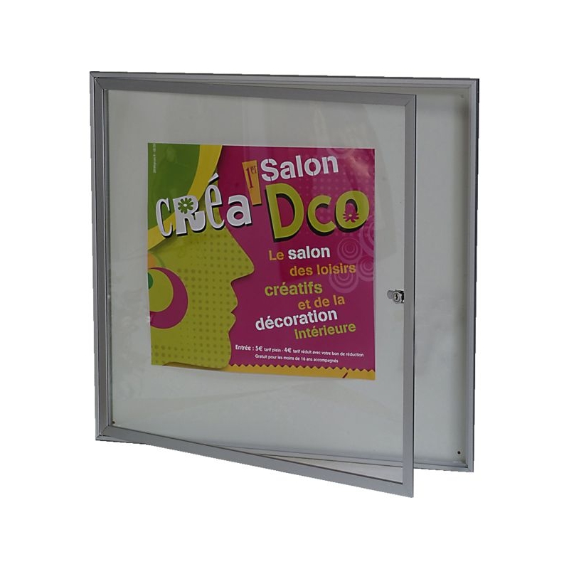 Porte battante, fermeture par serrure à clé avec pose à droite. Profil alu anodisé naturel, façade plexiglass avec entourage à partir du formats 6 feuilles. Fond tôle blanc pour affichage magnétique. Fixation murale 4 points. Absence d'entourage de porte pour le format 4 feuilles. Épaisseur hors-tout : 20 mm Épaisseur utile : 12 mm